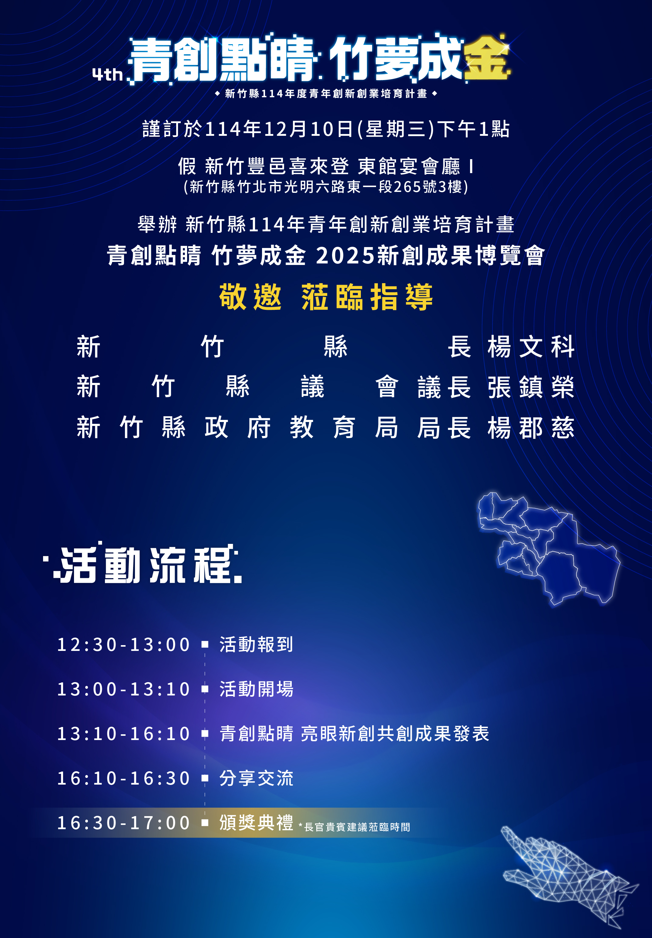 新竹縣政府辦理「青創點睛 竹夢成金 2025新創成果博覽 會」,即日起開放報名相關事宜。
