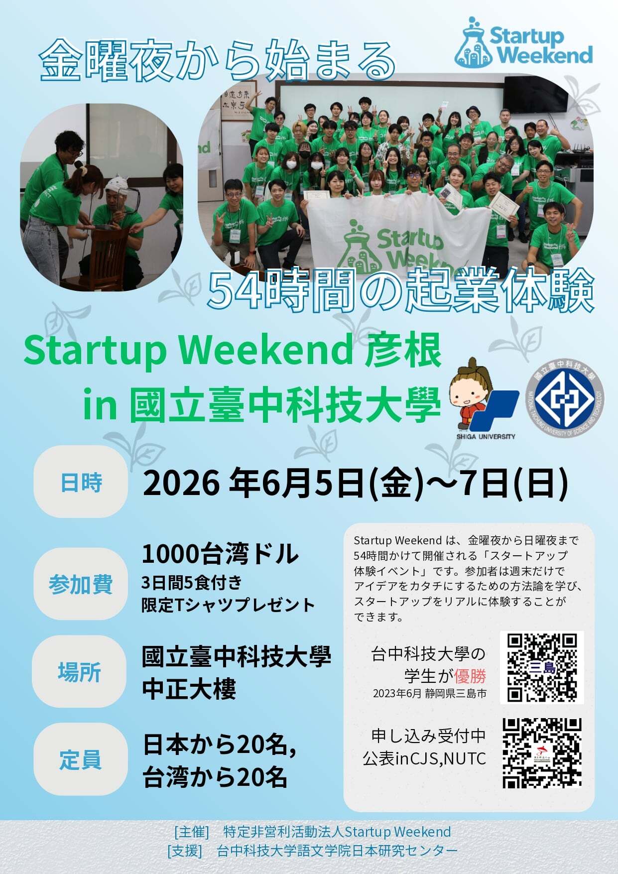 主旨:國立臺中科技大學日本研究中心訂於115年6月5日至7日舉辦「Startup Weekend 彦根 in 國立臺中科技大學」,誠摯邀請本屬師生同仁報名參加。