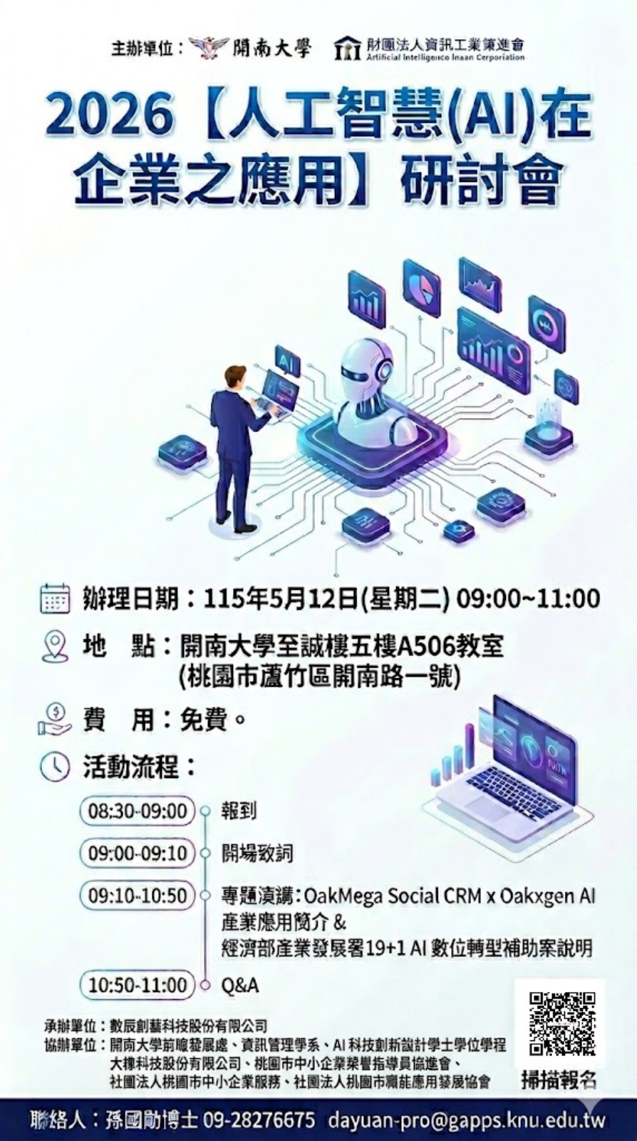 主旨:開南大學與財團法人資訊工業策進會預計於115/5/12(二)09:00-11:00聯合於開南大學辦理之【2026人工智慧(AI)在企業之應用】,鼓勵本屬廠商踴躍報名參加。